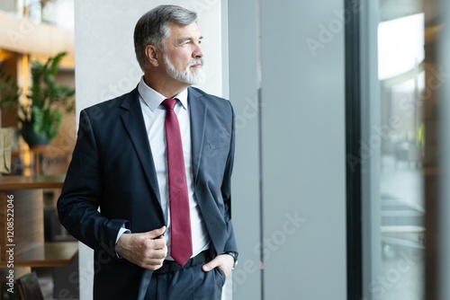 mature business leader senior manager standing by window, thinking