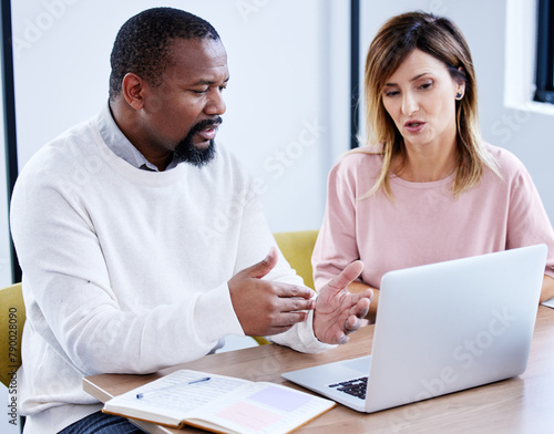 Mature business people, laptop and talking in office for online career report, project management or email feedback. Profession, conversation and digital tech for collaboration and planning indoor