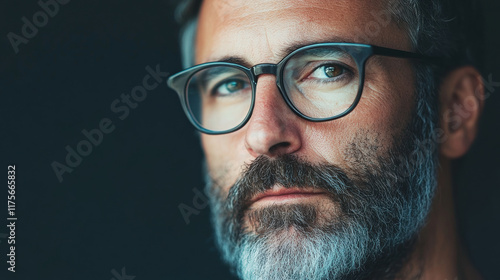 Mature Caucasian Male with Glasses and Beard in Thoughtful Expression