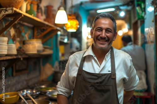 chef, eatery, kitchen, small, business, owner, smiling, happy, proud, mature, adult, man, food, service, cooking, culinary, professional, job, career, work, apron, counter, equipment, pot, pan, dish, interior, night, light, blur, depth, field, authentic, genuine, real, people, 1, person, ethnicity, looking