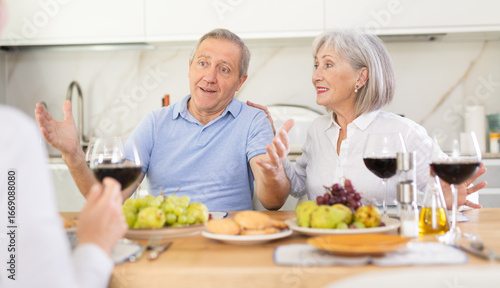 Mature couple are sitting at table with elderly woman friend, drinking wine and enjoying snacks, chatting merrily, raise glass to, celebrating important event.