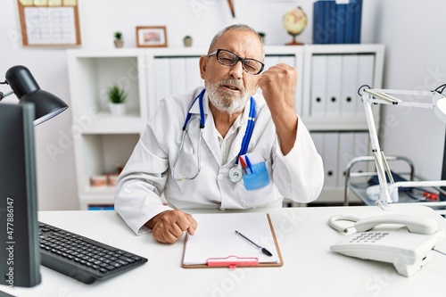 Mature doctor man at the clinic angry and mad raising fist frustrated and furious while shouting with anger. rage and aggressive concept.