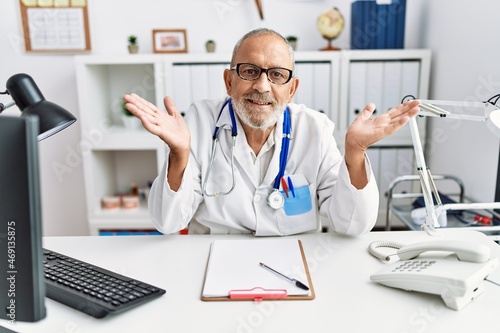 Mature doctor man at the clinic clueless and confused expression with arms and hands raised. doubt concept.
