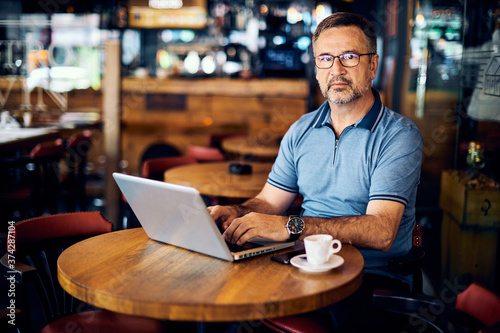 Mature entrepreneur sitting in cafeteria, using laptop for work and looking at camera.