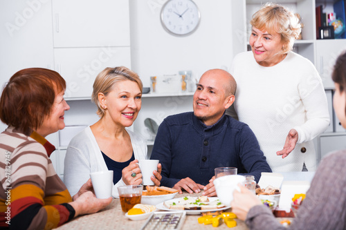 Mature friends are talking about life and drinking tea