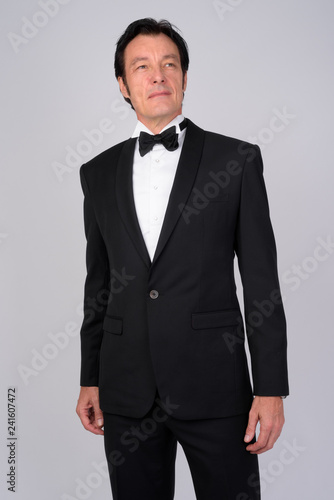 businessman, business, man, people, portrait, mature, 50s, photogenic, studio, shot, isolated, white, background, person, chroma key, caucasian, male, man, guy, adult, attractive, suit, professional, executive, corporate, formal, entrepreneur, tuxedo, attaching, bow tie, standing, looking, up, thinks, thinking, pensive, idea, concept