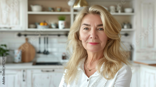 Mature Housewife Portrait at White Kitchen Interior. Grandmother