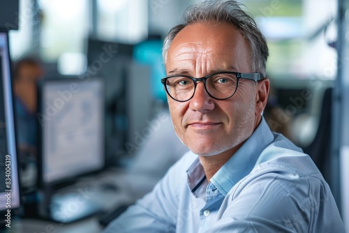 Mature IT manager, confident, professional, digital SLR, standard zoom, daytime, IT office portrait, digital, high realism, office light. , background blur