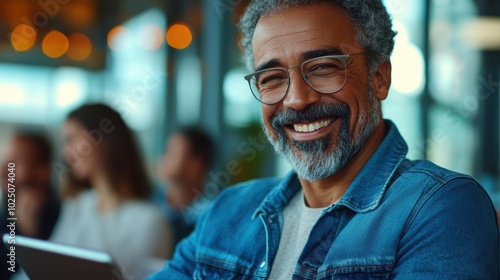 Mature man in a casual denim jacket using a tablet and smiling during a relaxed meeting, close-up with indistinct colleagues in the background.