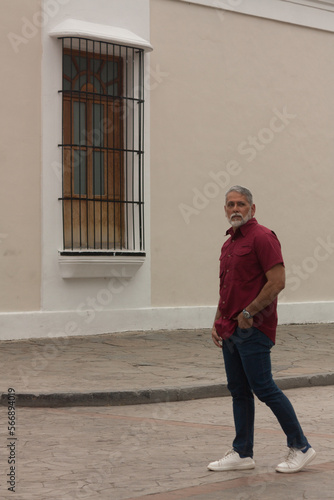 grey hair, street, man, mature, outdoors, senior, outside, positive, red, red shirt, jean, skinny, sneaker, portrait, lifestyle, male, adult, old, senior citizen, aged, positivity, caucasian, content, architecture, caribbean, hispanic, urban, latin america, america, architectural, latin, travel, classical, old-timer, vintage, traditional, american, historic, column, 50s, watch, white, grey, fashionable, confident, entrepreneur, building, happy