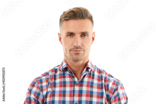 man, portrait, style, mature, casual attire, guy, face, hair, skin, skincare, photogenic, menswear, adult, lifestyle, isolated, isolated on white, man, male, caucasian, stylish, coiffure, chequered, shirt, model, haircut, handsome man, trendy, young men