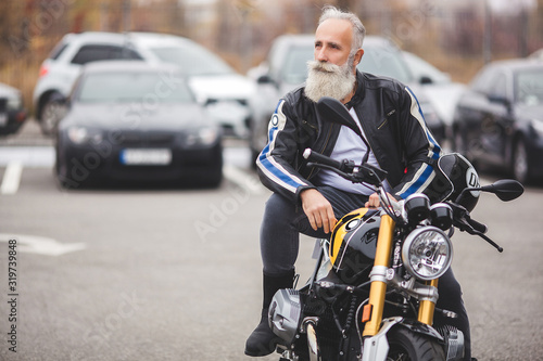 Mature man riding a motorcycle. Old male on motorbike. Bearded man outdoors driving.