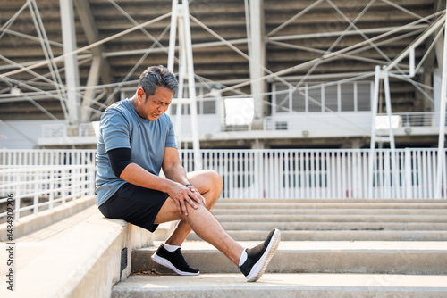 Mature man tired and leg pain during jogging at sport stadium. Runner has sore knees because he has been running for too long. Exercising until the injury. Training athlete work out at outdoor.
