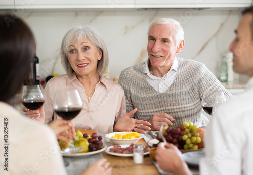 Mature spouses sitting at table, enjoying food and wine, chatting talking laughing with adult son and his girlfriend. In homely atmosphere male and female pensioner celebrate anniversary with guests