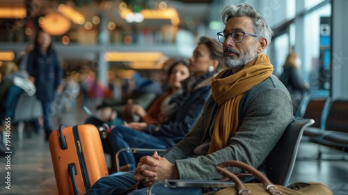 waiting, stylish, thoughtful, baggage, travel, sophisticated, foulard, goggles, seated, contemplation, patient, journey, anticipation, business travel, leisure, elegant, businessman, calm, solo, airport terminal, mature, distinguished, ready, composed, business attire, refined, poised, relaxed, adult, photogenic, grey hair, eyewear
