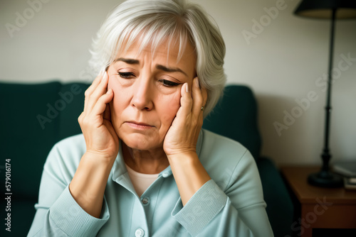 Mature woman sitting on the sofa feeling sad and alone. Upset elderly 70s female have headache while in living room at home. Generative ai.