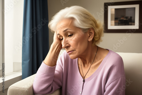 Mature woman sitting on the sofa feeling sad and alone. Upset elderly 70s female have headache while in living room at home. Generative ai.