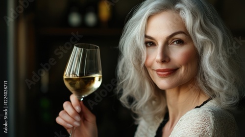 Mature woman with elegant silver hair holding a glass of white wine indoors with warm natural light showcasing sophistication and relaxation
