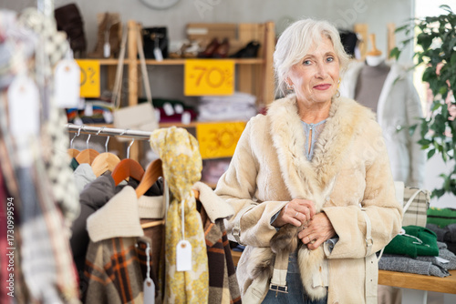 store, american, european, spanish, caucasian, shop, visitor, sale, price, shopping, clothing store, discount, shopping centre, clothes, woman, jacket, senior, elderly, mature, pensioner, older, grey hair, assortment, showroom, satisfied customer, fur, fitting
