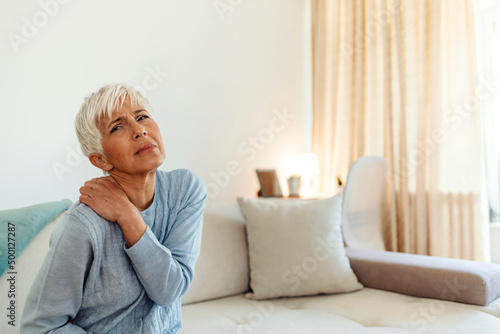 Mature woman with shoulder pain. Elderly woman is enduring awful ache. Shoulder pain in an elderly person. Beautiful lady with shoulder pain. Photo of senior woman holding her neck in pain.