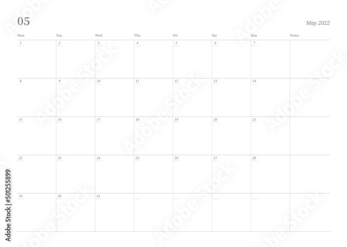 2022, calendar, may, 5, template, schedule, planner, plan, note, diary, memo, illustration, day, year, weekly, daily, yearly, monthly, month, weekday, date, monday, tuesday, wednesday, th, friday, sunday, vector, grid, print, time, document, form, paper, line, space, week, office, business, design, art, graphic, digital, lifestyle, background, spring, notebook, page
