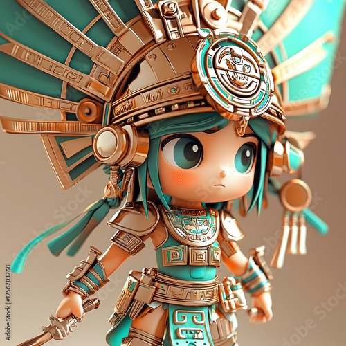 Mayan Warrior Princess 3D Render of a Cute Cartoon Character in Gold and Teal Armor
