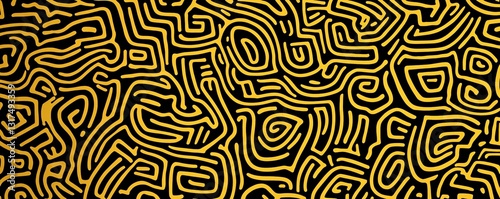 Maze-inspired hand-drawn doodle pattern, black and yellow abstract texture