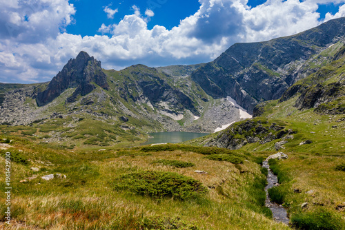meadow, stream, peak, lake, hill, mountain, bulgaria, nature, water, landscape, greenery, rock, formation, scenery, sky, cloud, outdoors, adventure, travel, wilderness, flora, fauna, hiking, terrain, sunlight, elevation, ecosystem, biodiversity, calmness, journey, summer, remote, exploration, national, park, scenic, view, cliff, grass, serenity, natural, beauty