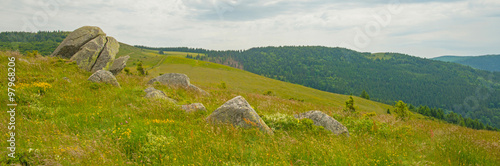mountain, hill, craggy, grass, flower, wildflower, flowery, meadow, vale, field, nature, vosges, cloud, sky, rural, countryside, outdoors, scenic, landscape, green, summer, season, tranquil, sunlight, perspective, horizon, france