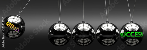 Meaning, ideas and relation of two concepts: mind and success, pictured as Newton cradle with metal balls giving energy and momentum to each other, labelled with english words, 3d illustration