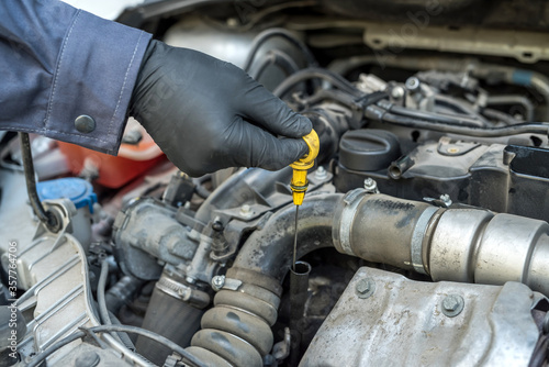 mechanic after change of oil in the engine checks level and quality on a probe.