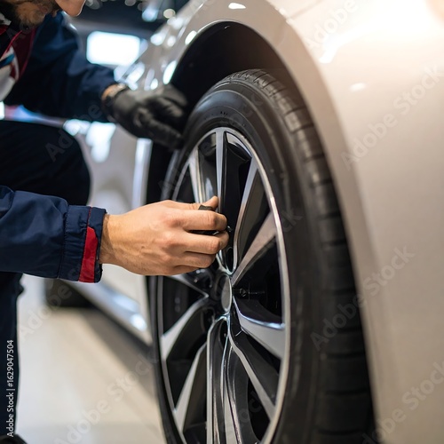 mechanic, tire, pressure, car, silver, wheel, check, maintenance, automotive, service, inspection, repair, vehicle, alloy, rim, rubber, inflation, safety, road