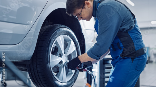 Mechanic in Blue Overalls is Unscrewing Lug Nuts with a Pneumatic Impact Wrench. Repairman Works in a Modern Clean Car Service. Specialists Removes the Wheel in Order to Fix a Component on a Vehicle.