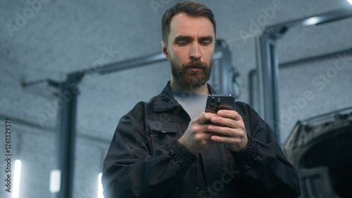 Mechanic man auto mechanical worker using mobile phone gadget in repair car service garage automobile factory pensive thoughtful male guy repairman look at smartphone screen think typing on cellphone