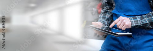Mechanic using digital tablet for checking car engine; panoramic banner