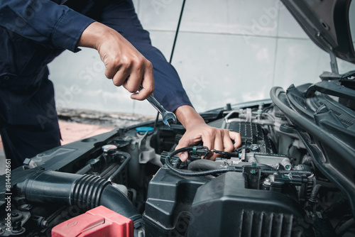 Mechanic using wrench while working on car engine outside the service center , Repair and service.