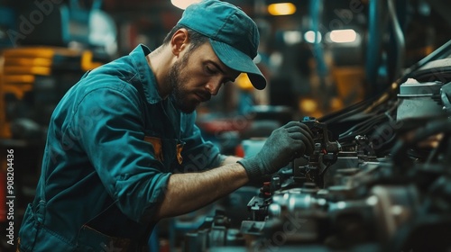 mechanic, engine, repair, work, car, automobile, garage, service, maintenance, professional, workshop, technician, industry, automotive, tool, machinery, labor, skilled, man, men at work, blue, glove, cap, focused, industrial, serious, concentrated, inspection, auto, part, equipment, steel, metal, iron, mechanical, engineering, interior, indoor, dark, working man