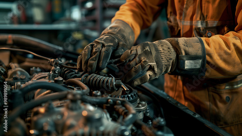 Mechanic Working on Engine with Greasy Gloves in a Workshop Setting..