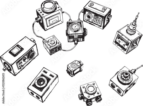 Mechanism set, retro, vintage, steampunk, cyberpunk, decorative elements. Ideal design for social media, cover, banner, flyer, music, ads.