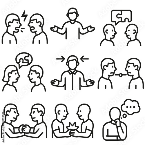 Mediation Icon Set. Line style icons of group disagreement and mediation: two sides debating icon, conflict in group scene,