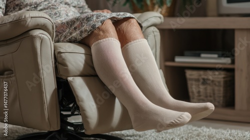 Medical Compression socks. Comfortable feet in cozy socks on a relaxing chair at home.