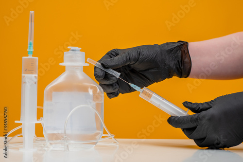 Medical concept. Syringes and a bottle of chemical liquid on an orange background. Preventing the spread of diseases. Vaccination. Medical manipulation.