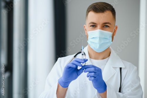 Medical doctor holds vaccine for a patient.