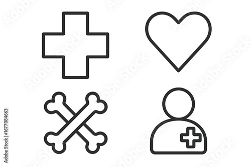 Medical health care icon set. Simple linear pictograms of a cross, heart, bones, and patient. Outline symbols for medicine, hospital, cardiology, and orthopedics. Vector.