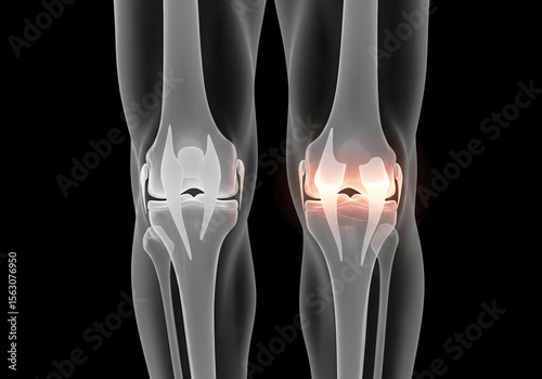 knee, joint, pain, arthritis, bone, inflammation, anatomy, orthopedics, medicals, illustration, three-dimensional, render, x-ray, radiology, scan, comparison, healthy, diseased, damaged, degradation, chronic, ageing, femur, cartilage, ligament, tendon, skeleton, system, diagnosis, health care, medicine, human, body, leg, before, after, glowing, black, background, isolated, clean, painful