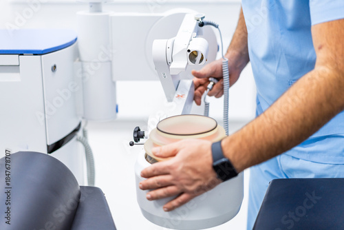 Medical imaging unit adjusted by technician. Clinical preparation of diagnostic device near examination table