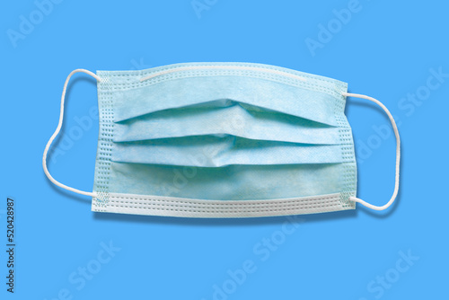 Medical mask. Disposable medical surgical mask. Protection against respiratory infections. Isolate on blue background. Health care and medical concept