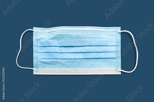 Medical mask. Disposable surgical mask. Protection against respiratory infections. Isolate on dark blue background. Danger of a viral infection. Medical concept