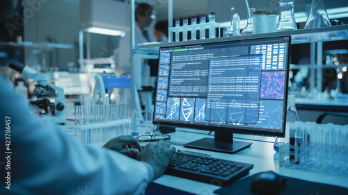 Medical Research Scientist Typing Sophisticated Coding on His Desktop Computer in a Biological Applied Science Research Laboratory. Lab Engineers in White Coats Conduct Experiments in the Background.