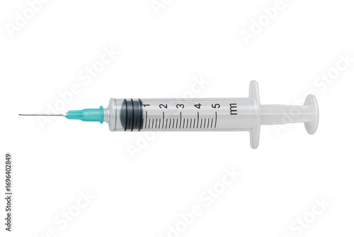 Medical syringe with needle pointing left on transparent background